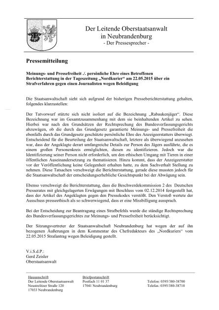 In einer Pressemitteilung gibt der Oberstaatsanwalt in Neubrandenburg bekannt, er habe Anzeige wegen Beleidigung erstattet gegen Nordkurier-Chefredakteur Schumacher.